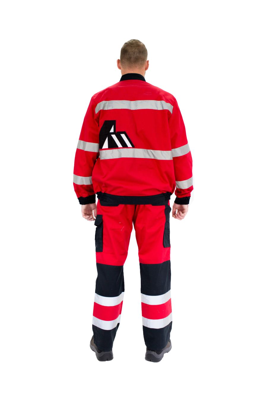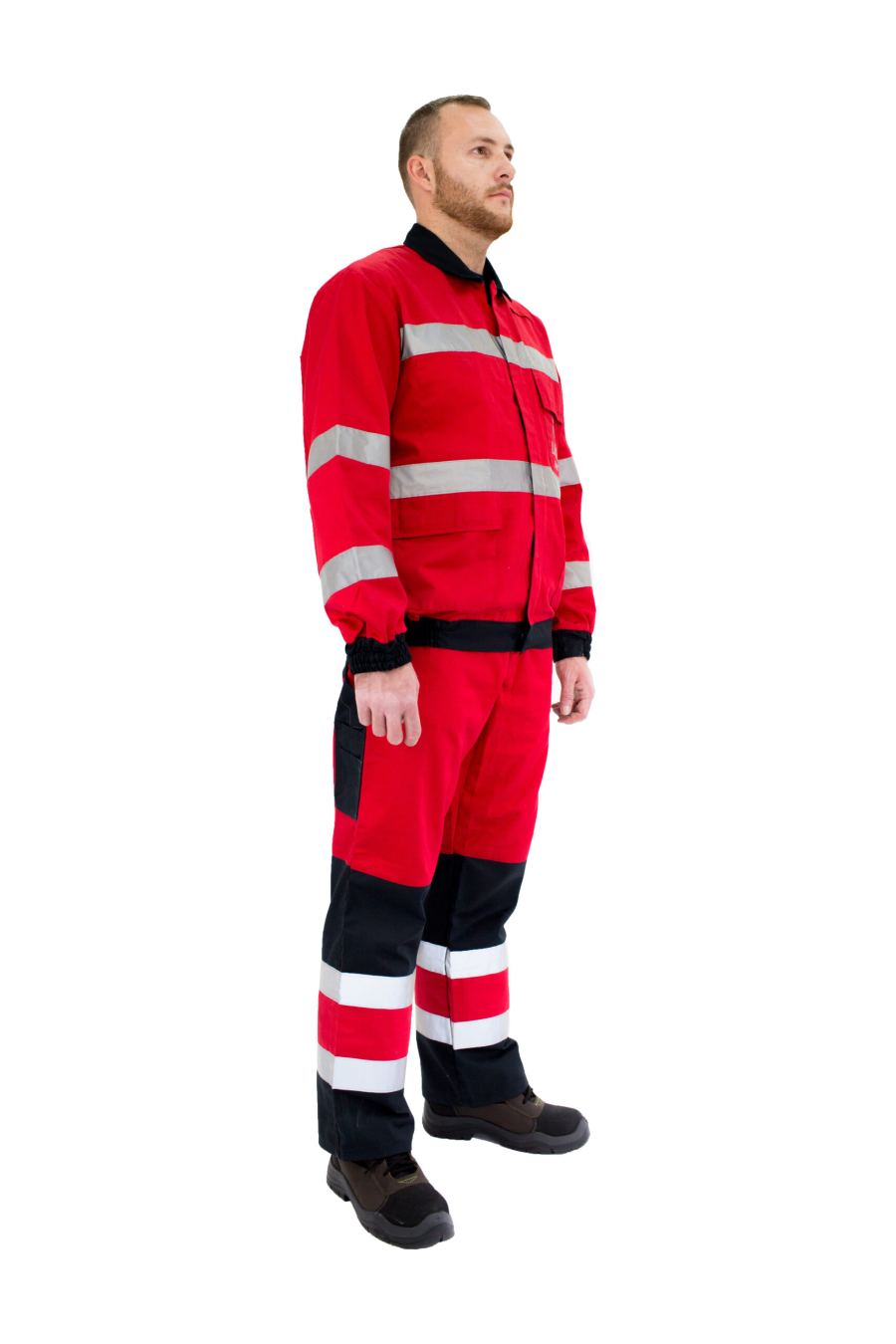 Dvodijelno crveno odijelo u kombinaciji sa crnom bojom i bijelim detaljima je kroj sa dosta praktičnih đepova. Na bluzi se nalazi reflektirajuća siva traka GP010 širine 5 cm. Sve patne na džepovima su sa prepustom za sprečavanje upadanja u džepove, gore desno unutarnji džep. Sadrži elastične manžetne i pojas za bolje pasovanje bluze. Svi završeci šavova i udarna mjesta na bluzi su dodatno pojačana bartack šavom. Garancija na 50 pranja. Mnoštvo korisnih dodataka kao što su reflektirajuće trake za veću vidljivost daju posebnu karakteristiku odijelu iz PremiWork kolekcije zaštitne odjeće, te na taj način čine ovo zaštitno odijelo popularnim izborom tamo gde je potrebna poboljšana uočljivost. Kopćanje naprijed sa lajsnom, drikerima ili čičkom, te rajfešlusom ispod zaštitne lajsne. Materijal Klopman Industro2 65% PES, 35% pamuk, 250 gsm.